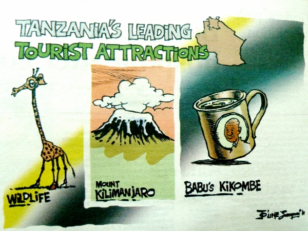 Local newspapers have parodied the event by publishing a cartoon, depicting that amongst the wildlife and Mt. Kilimanjaro he now accounts for one third of visitors to Tanzania — well, that’s life in Africa. Oh and by the way, if you’re trying to figure out what Kikombe in the cartoon means – it’s Swahili for “cup”.